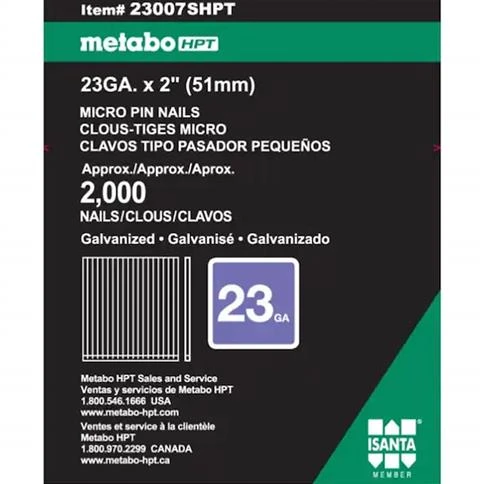 Metabo HPT 23007SHPT 2 in. 23-Gauge Galvanized Headless Micro Pin Nails (2,000-Pack) are manufactured at higher standards for material and workmanship to help eliminate downtime, so you can work more efficiently.